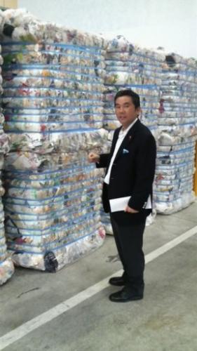 区民の皆様に分別していただいている容器包装プラスティクの処理工場の視察をしました。毎日12トンのプラスチックが回収され、ここで異物(缶・ペットボトル等)を取り除き