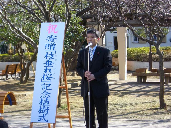 西瑞江公園の桜植樹祭 この西瑞江公園では毎年4月に「さくらまつり」が開催されます。「さくらまつり」だけど桜がこの公園には少ないのでもう少し桜を増やしてほしいとの地域の皆様のからご要望がありました。関係各所に働きかけた結果、区長さんや環境促進事業団ご協力により桜を8本新規に植えることができました。その植樹さいであいさつをしました。