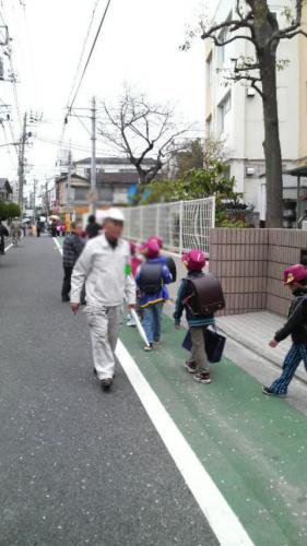 一之江小学校に入学した、新一年生が安全に帰宅できるように地域の皆さんが引率してくれます。