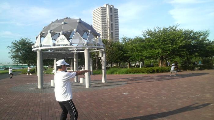 江戸川区ラジオ体操連盟会長として、地域のラジオ体操に参加、多くの人々が自然に集まってきてラジオ体操をしているのだそうです。