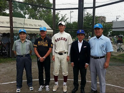 葛西西支部秋の大会開会式 西支部の秋の大会の開会式に出席しました。 山田支部長をはじめ西支部の皆様のご尽力に感謝です。 写真は、開会式の後、西支部出身で早稲田高等学院 軟式野球部で活躍した岡崎君が後輩たちを励ましにきました。 その写真です。