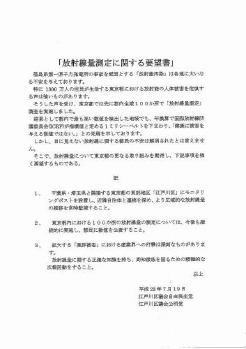 モニタリングポストの誘致を実現 7月19日に、区民の安全安心の観点から、モニタリングポスト設置の要望書を東京都杉村福祉保健局長に提出しておりました。 結果、宇田川都議会議員との連携ににより、モニタリングポストの誘致を実現しました。 設置場所 篠崎公園 設置予定 10月下旬 以下 要望書と写真を添付します。