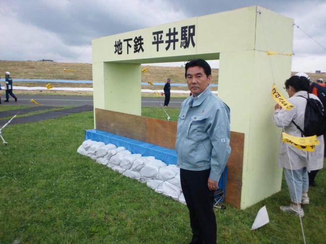 江戸川区は、約70%がゼロメートル地帯です。万一の時の水防訓練は重要です。写真は、地下鉄の入り口から水が浸入するのを防ぐ応急処置です。見事な手順でできていました。